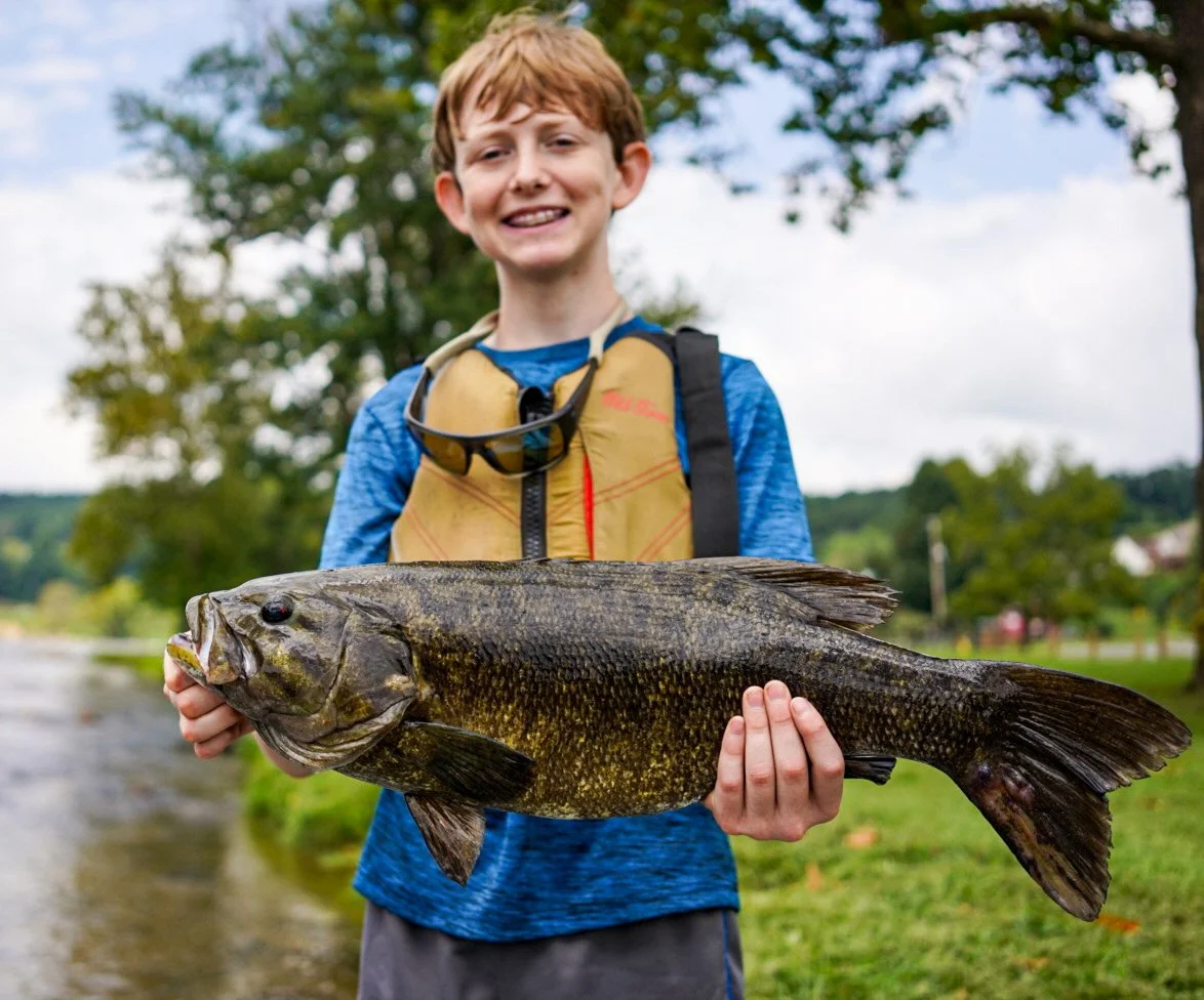 Haiden’s first trip was a short one on Lake Brandt that was mostly a dud, all things considered, but he ground it out and was rewarded handsomely on his second outing which was nothing short of epic. After trying the fly rod most of the morning with nothing showing interest we switched to spinning gear and Haiden tossed a nonchalant cast over into the middle of the river, in the opposite direction from where Patrick directed. We assumed Haiden was hung up, the rod came apart, the line was wrapped around the tip of the rod, but then it started moving- only the way it would if something alive were on the other end. Something alive and HUGE! Somehow, Patrick (by the grace of the Lord) expertly navigated all the obstacles and landed this smallmouth of a lifetime. Over 23 inches and over 6 pounds! Needless to say Haiden is ready to fish any time, any place now.